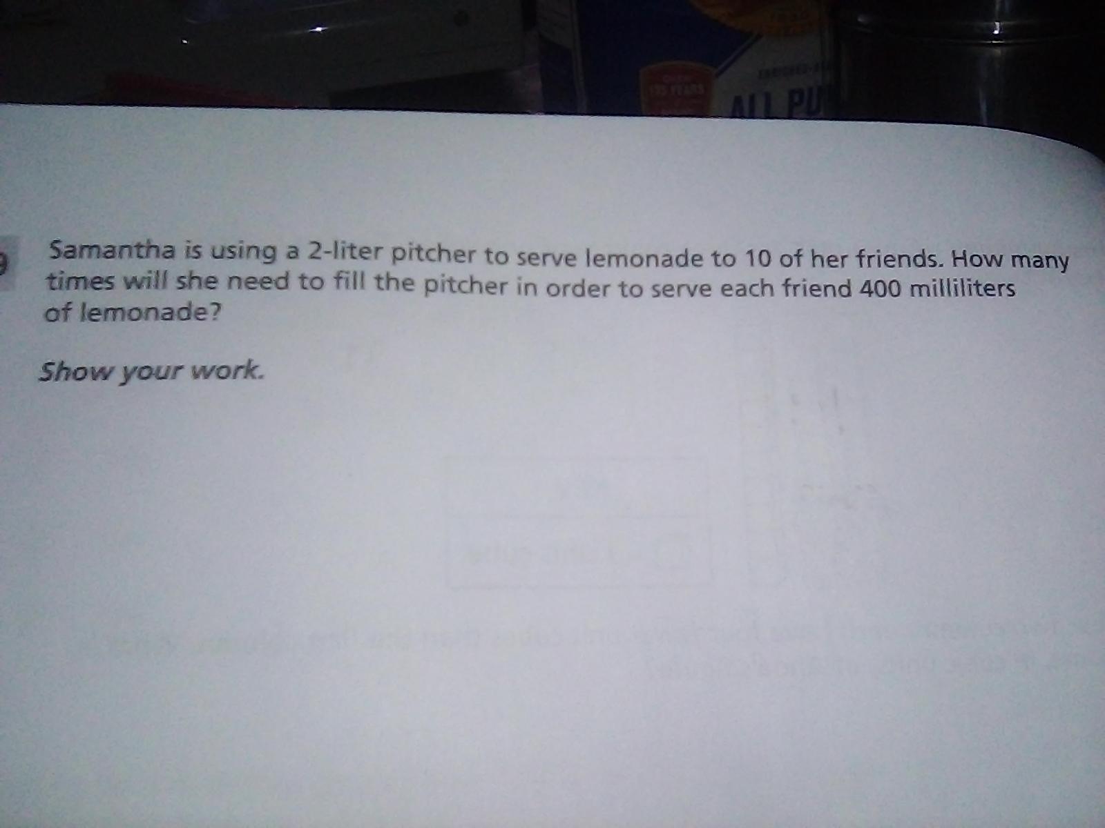 She will have to fill it twice because 2 liters in mL is 2000 and if she is giving 400mL to each friend you have to multiply 10 x 400mL which is 4000mL since the pitcher is 2 Liters or 2000 Ml she needs to fill the pitcher 2 times