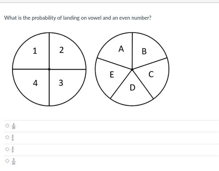 Thereore, the probability of landing on a vowel and an even number is 4/20.