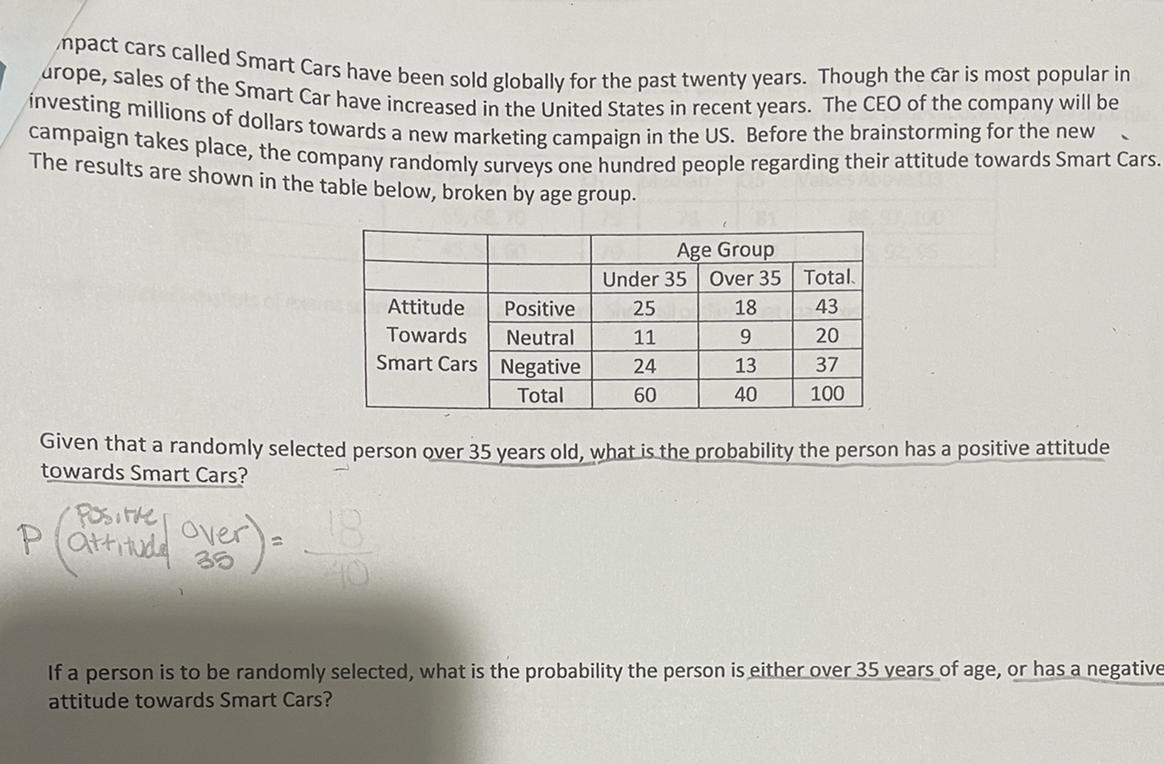 • There are 40 people over 35 in the survey. You want the probability that someone randomly chosen from this group has a positive attitude, of which there are 18. Hence the probability is 18/40 = 9/20.