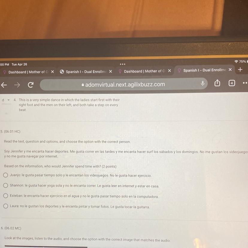D. Laura: no le gustan los deportes y le encanta pintar y tomar fotos. Le gusta tocar la guitarra.