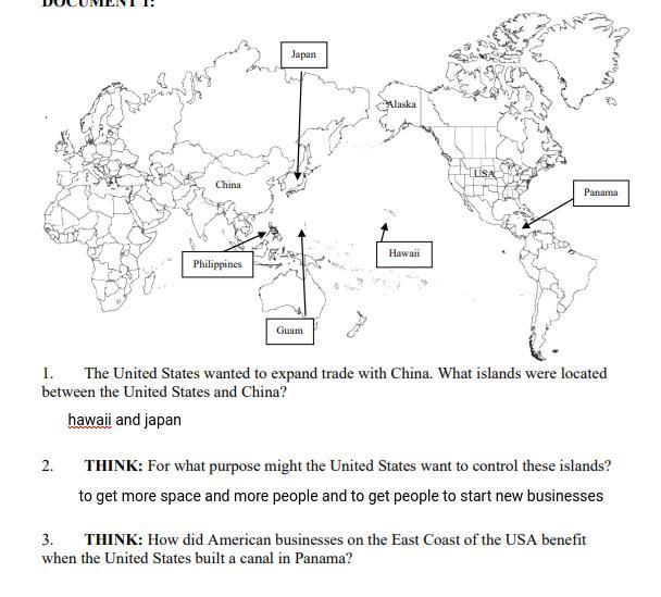 1. There are a number of islands that are between the United States and China. However, the named ones that would be used would be Hawaii (which is part of the U.S.), followed by Guam (A U.S. territory), and then the usage of Philippines (A U.S. annexed territory), and then the usage of Japan as well (through the usage of open-door policy) as another option for access to China.