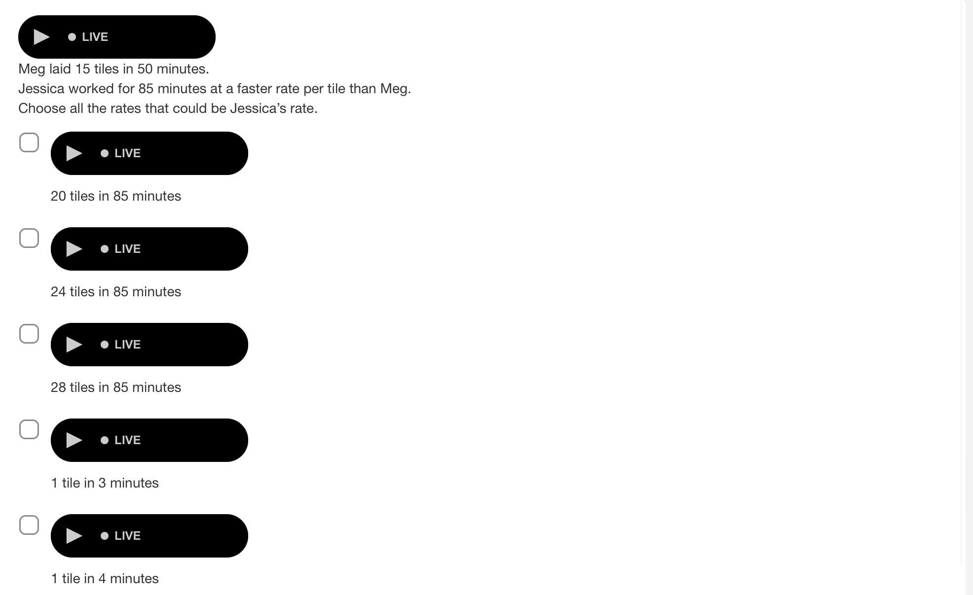 If she lays 1 tile in 4 minutes, it will take her 4 / 1 = 4 minutes per tile, so it can't be this one.