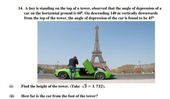14. A boy is standing on the top of a tower, observed that the angle of depression of a car on the horizontal ground is 60". On