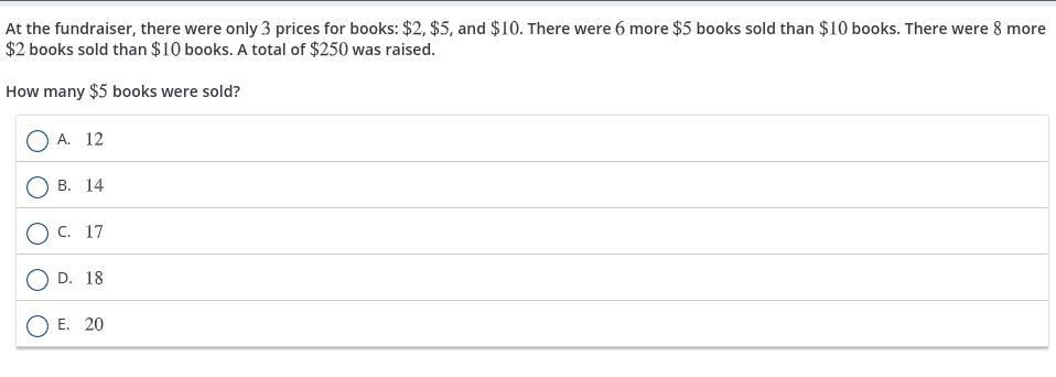 Since, the fundraiser only have three prices for books($2, $5 and $10), the number of $5 book that was sold is 12.