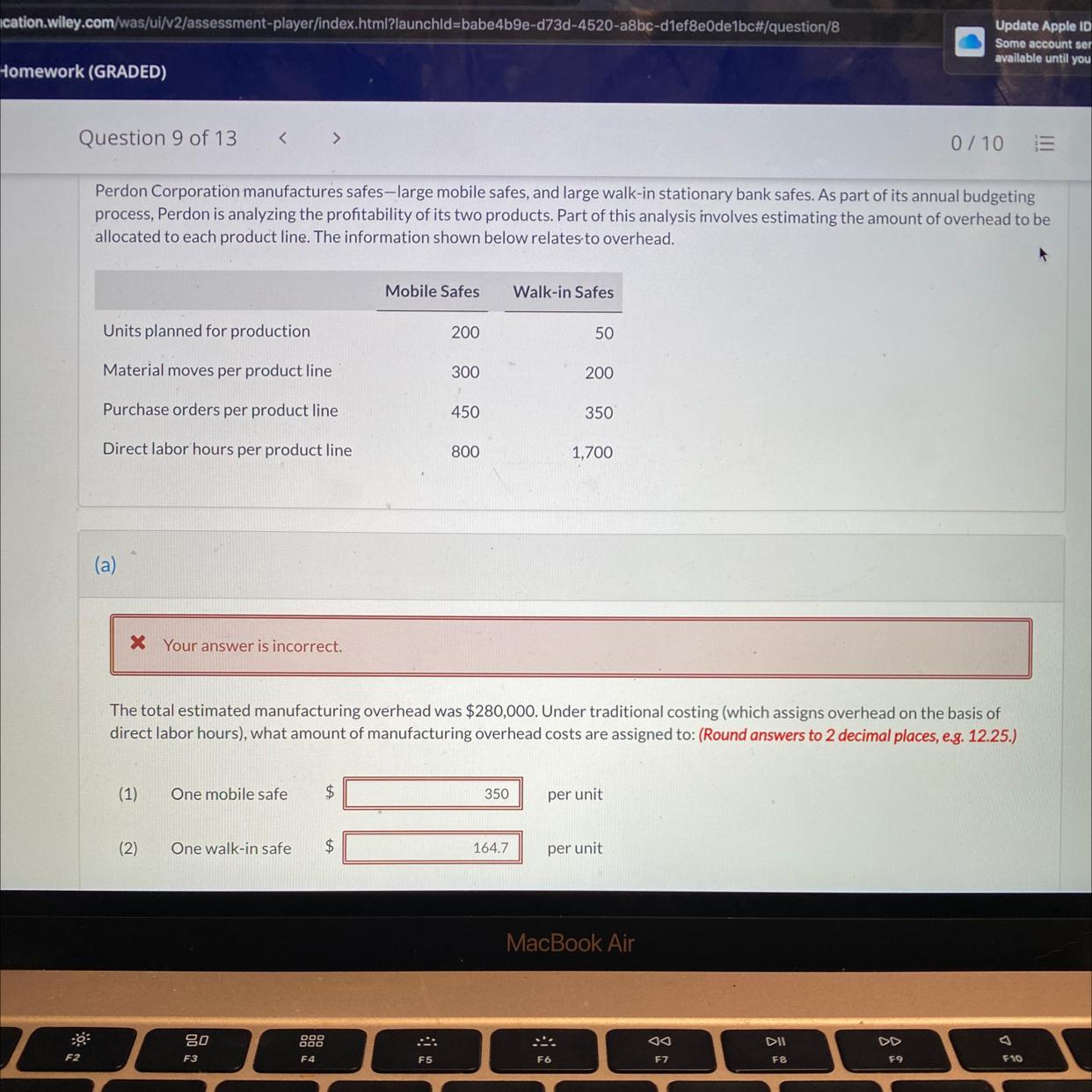 Thus, under the traditional costing method, the amount of manufacturing overhead costs assigned are $448 per unit of Mobile Safe and $3,808 per unit of Mobile Safe.