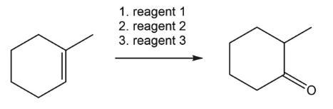 Three step synthesis of the product from 1‑methylcyclohexene includes epoxide formation, nucleophilic attack and oxidation of -OH group.