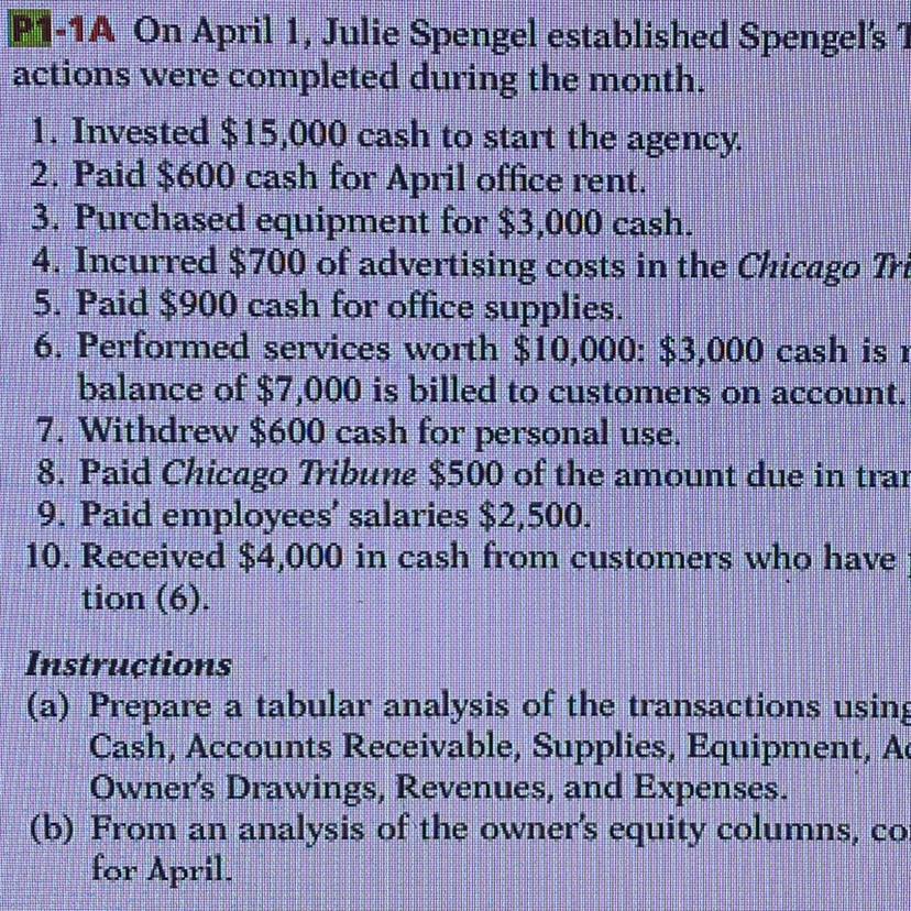 a) The preparation of a tabular analysis of the transactions for Spengel's Travel Agency using the following headings is as follows: