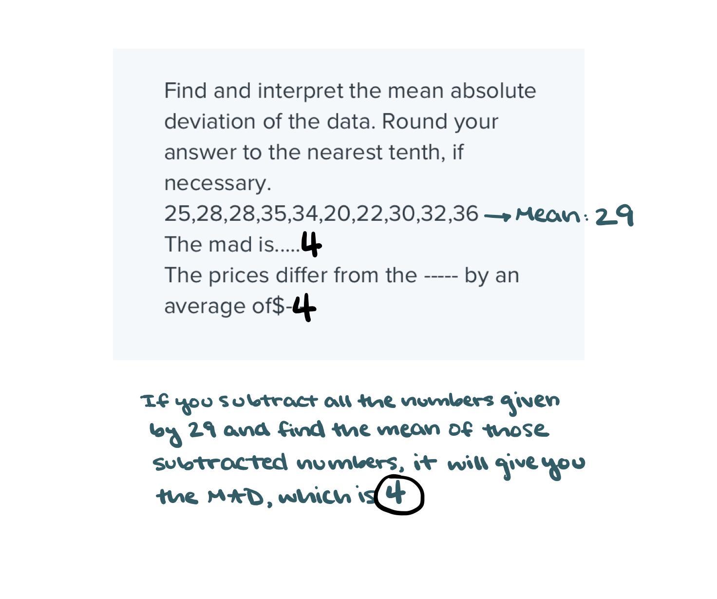Find and interpret the mean absolute deviation of the data. Round your answer to the nearest tenth, if necessary. 25,28,28,35,34