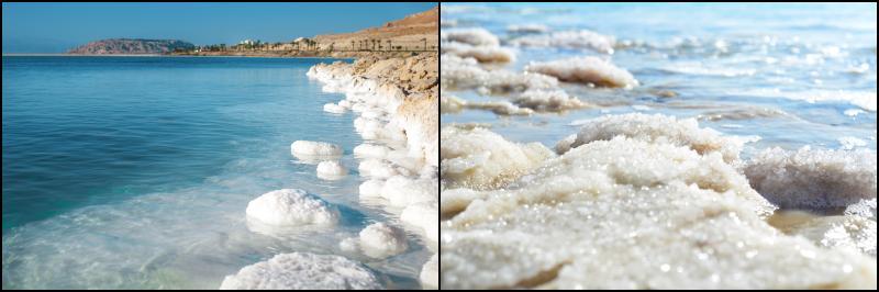 One of the most significant characteristics of the Dead Sea is its salinity level. The images show the rock salt deposits on the shore.