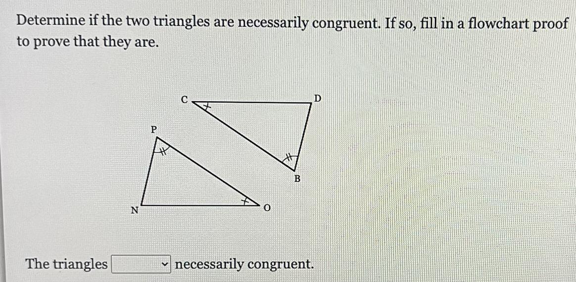 Thus, the information given is not enough to prove that triangles PON and BCD are congruent triangles, however, they may be similar triangles based on the AA similarity theorem,