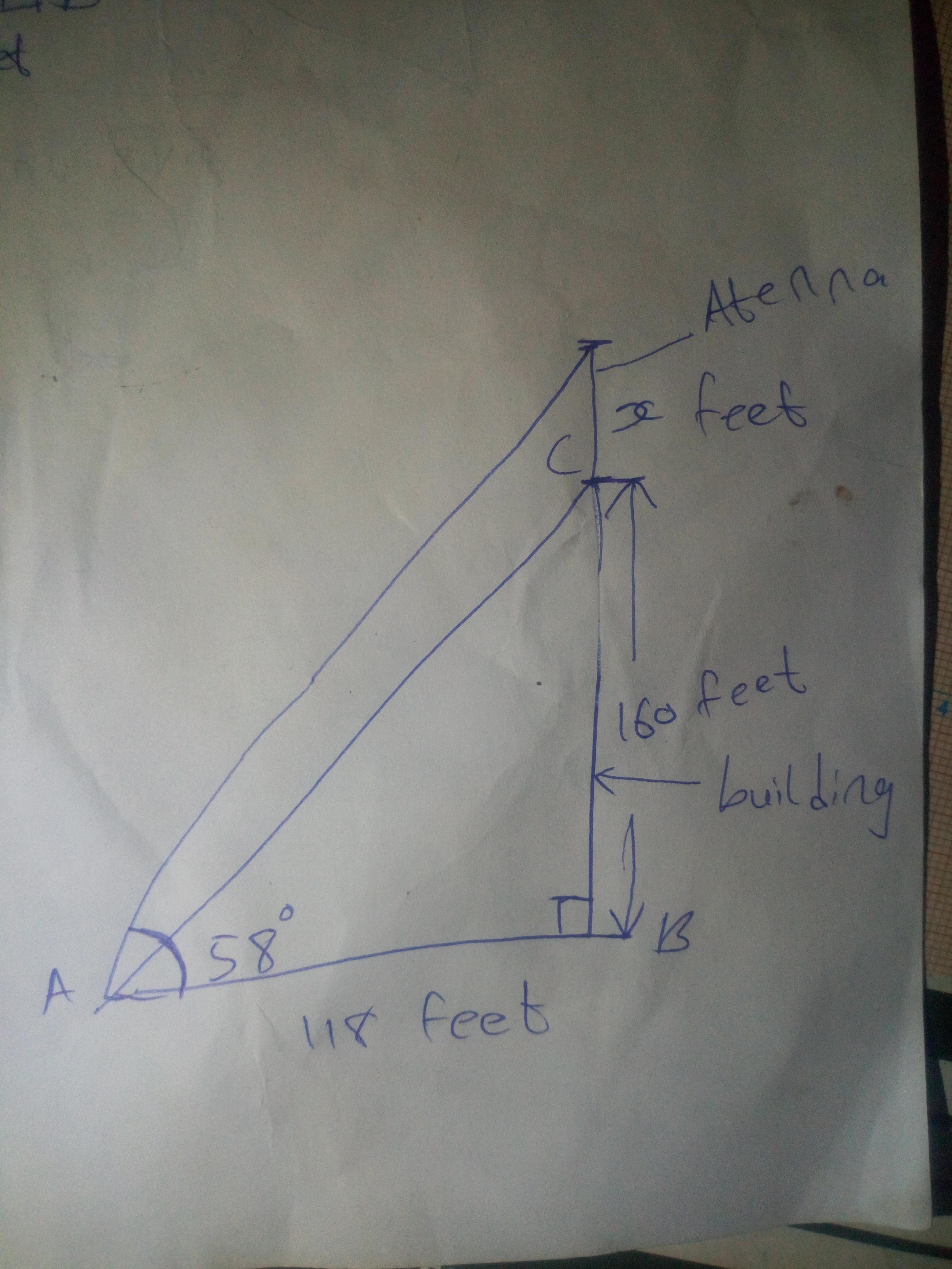 Let x represent the height of the antenna. Therefore, the height of the building and the antenna would be (160 + x) feet