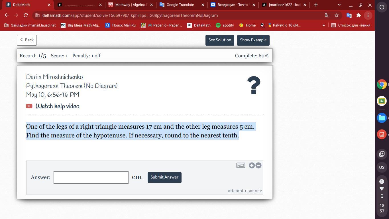 One of the legs of a right triangle measures 17 cm and the other leg measures 5 cm. Find the measure of the hypotenuse. If neces