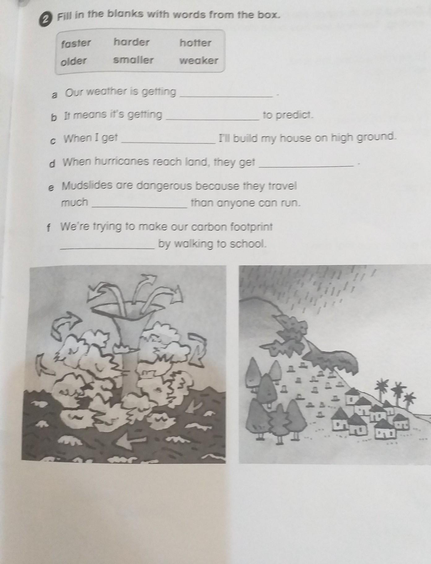 2 Fill in the blanks with words from the box. harder faster hotter older smaller weaker a Our weather is getting b It means it's