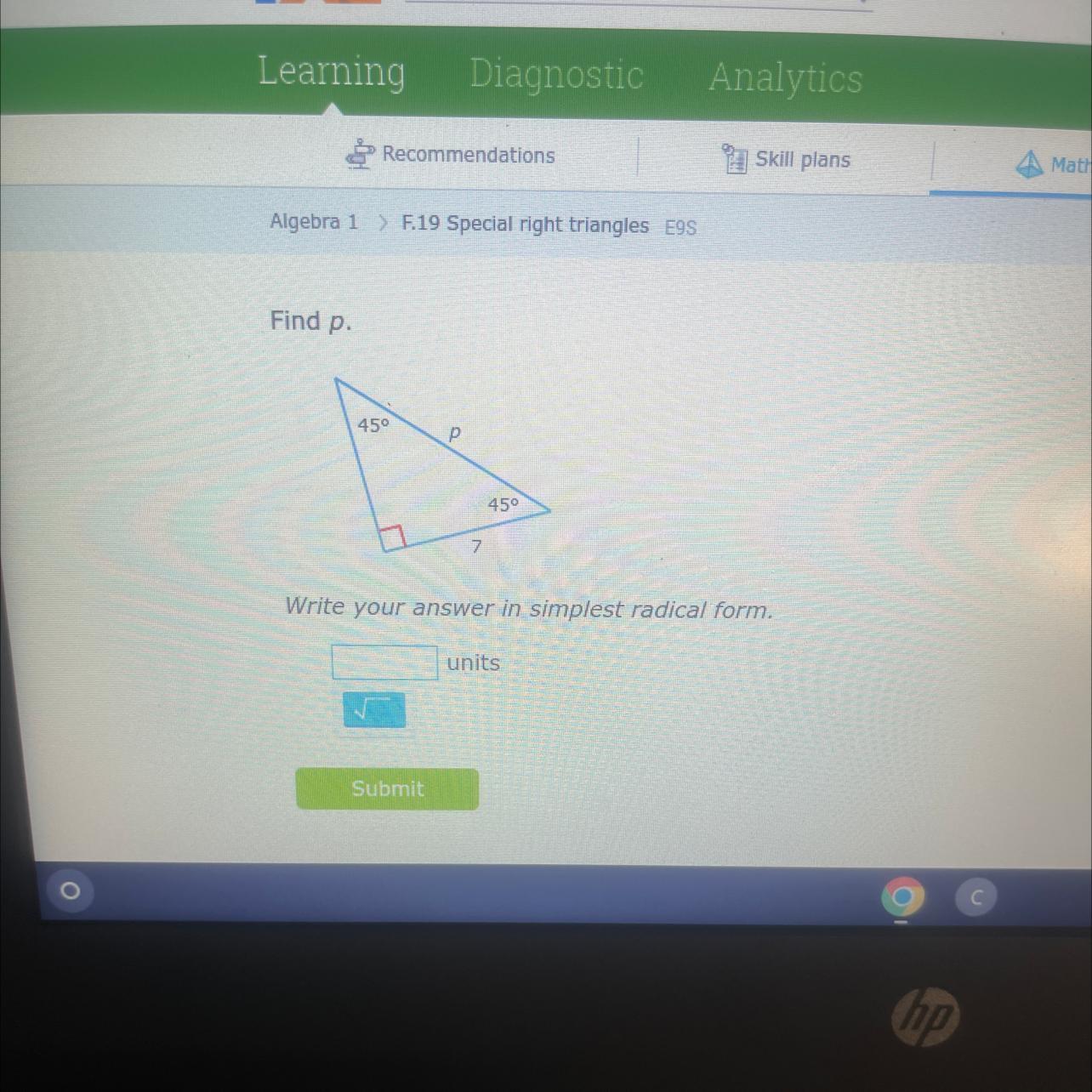 The length of the bottom adjacent side of the 90-degree angle is 7, so p would be 7\sqrt{2}