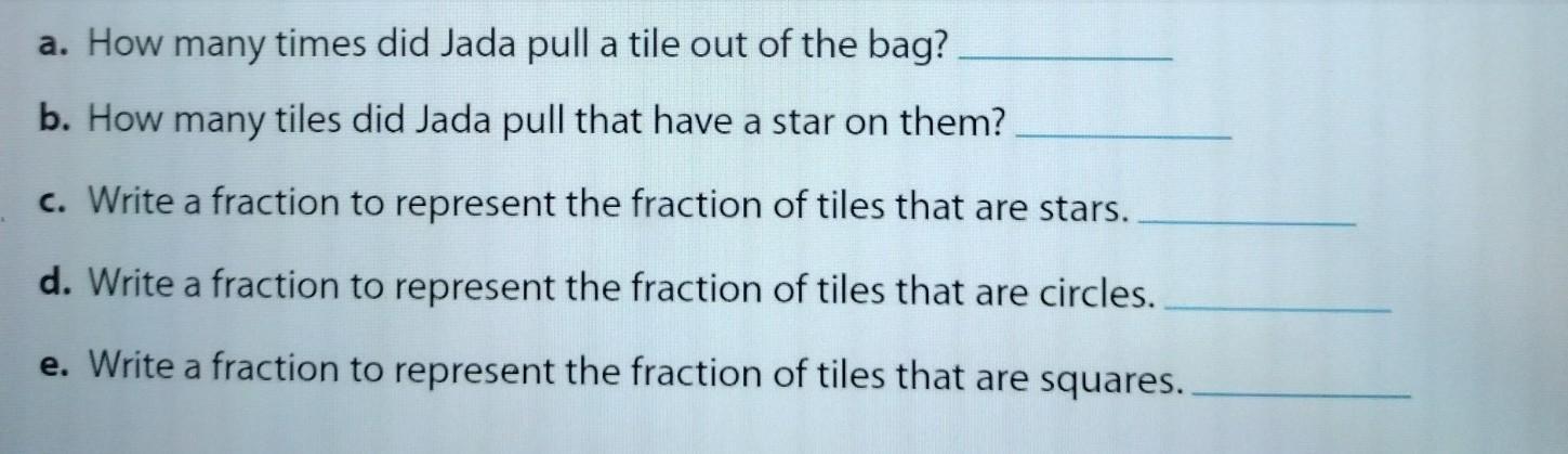 If Jada repeats the experiment, She would likely again pull more stars than circles or square. She may get different number of stars,circles or squares but over a large number of trials, she would expect the ratio of the stars in the proportion. We can use this proportonal relationship to get the reasonable prediction about te number of times she pull different shape tiles.