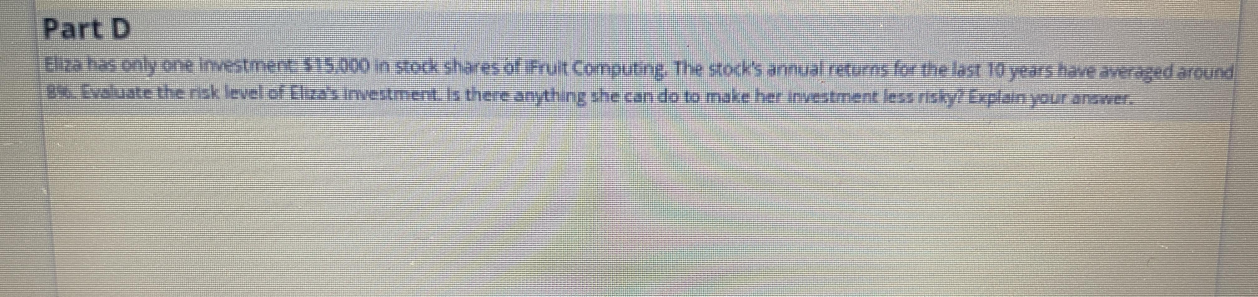 averaged around 89. Evaluate the risk level of Eliza's Investment. Is there anything she can do to make her investment less risky? Explain your answer.