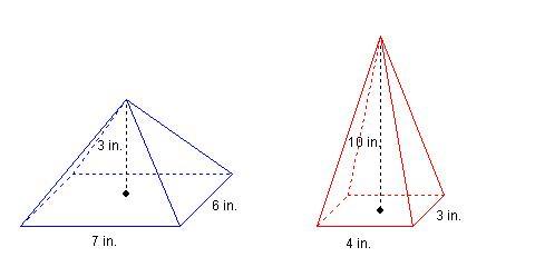 s by 6 inches and height of 3 inches. A rectangular pyramid on the right with a base of 4 inches by 3 inches and a height of 10 inches. The volume of the pyramid on the left is greater by 2 inches cubed.