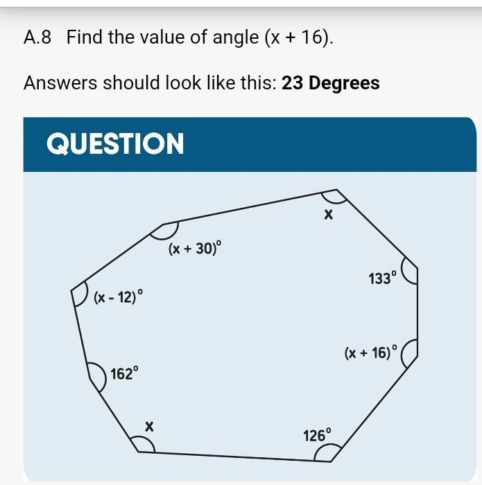 To find x, sum all the given angles, equate to 1080°, then solve for x: