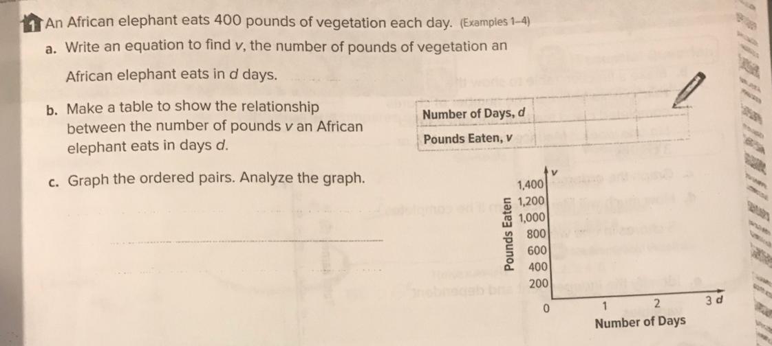 a) The elephant eats 400 pounds of vegetation each day, therefore to find the total amount v it has eaten after a certain number of days d, just multiply 400 by d: