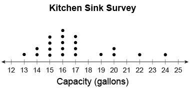 The line plot illustrates the capacity of the kitchen sink in gallons, and it has a sample size is 21. The distribution is positively skewed, with an appropriate measure of center is 16 and an appropriate measure of spread is 2.5