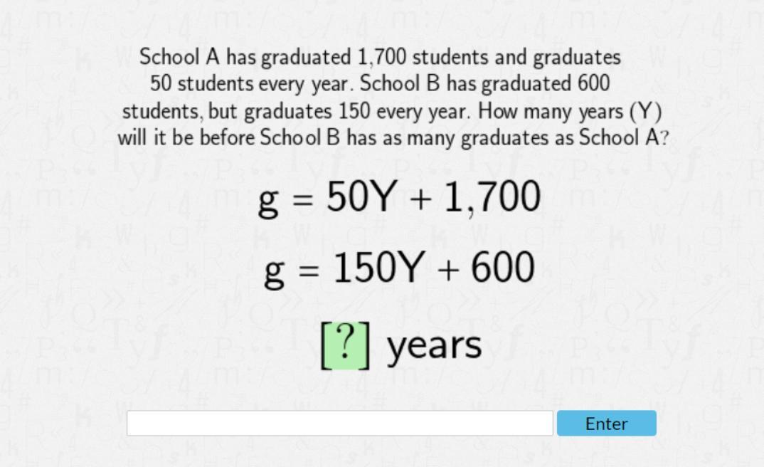 Using these two equations we want to find how many years it will take before school B has as many graduates as school A