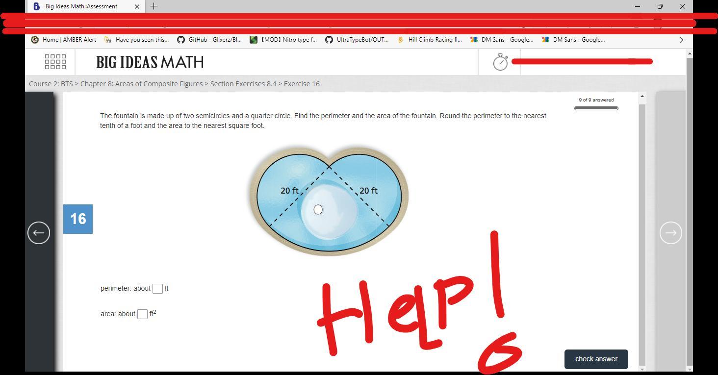 You can see the fountain is made of 2 semicircles. You can apply the same area formula to both. The fourth circle has a fourth of the area of a circle. Add all 3 areas to get the fountain's area. Since the circumference of a circle is it's perimeter, find the circumference of all of the circles and add them up. THE sums is the fountain's perimeter.