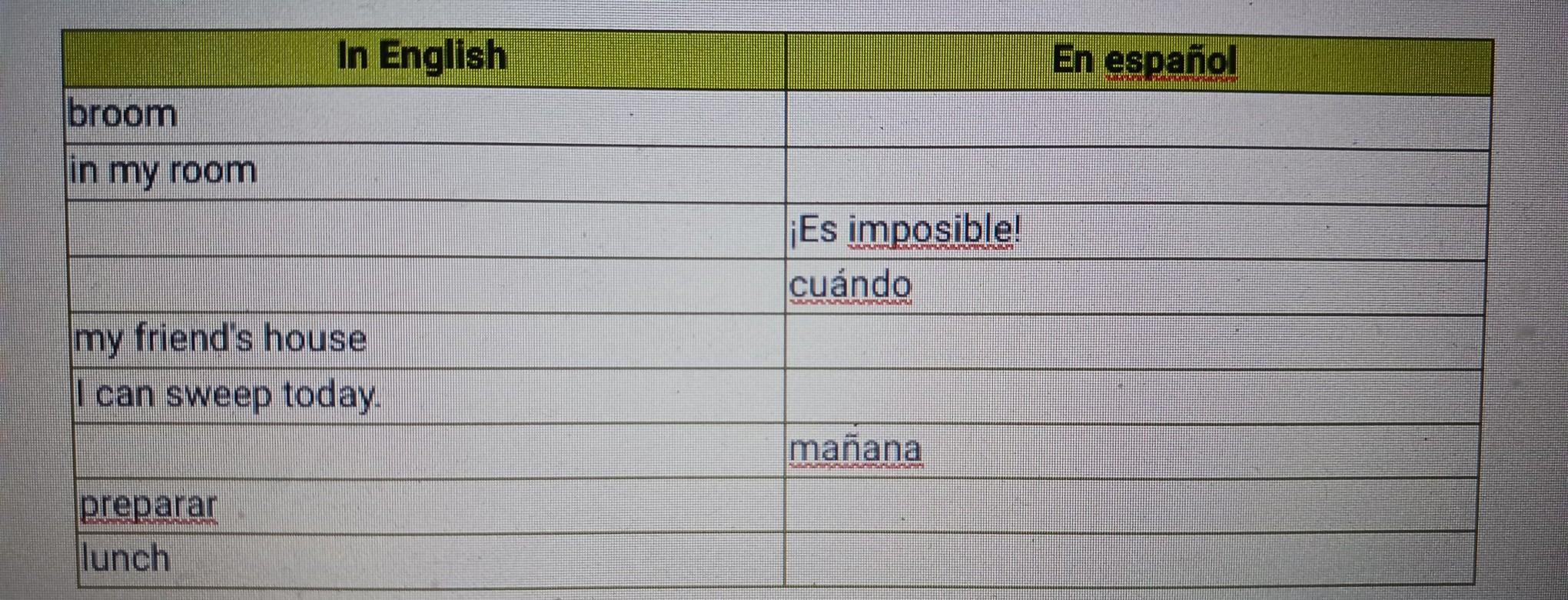 Complete the following chart with the corresponding English or Spanish vocabulary words.