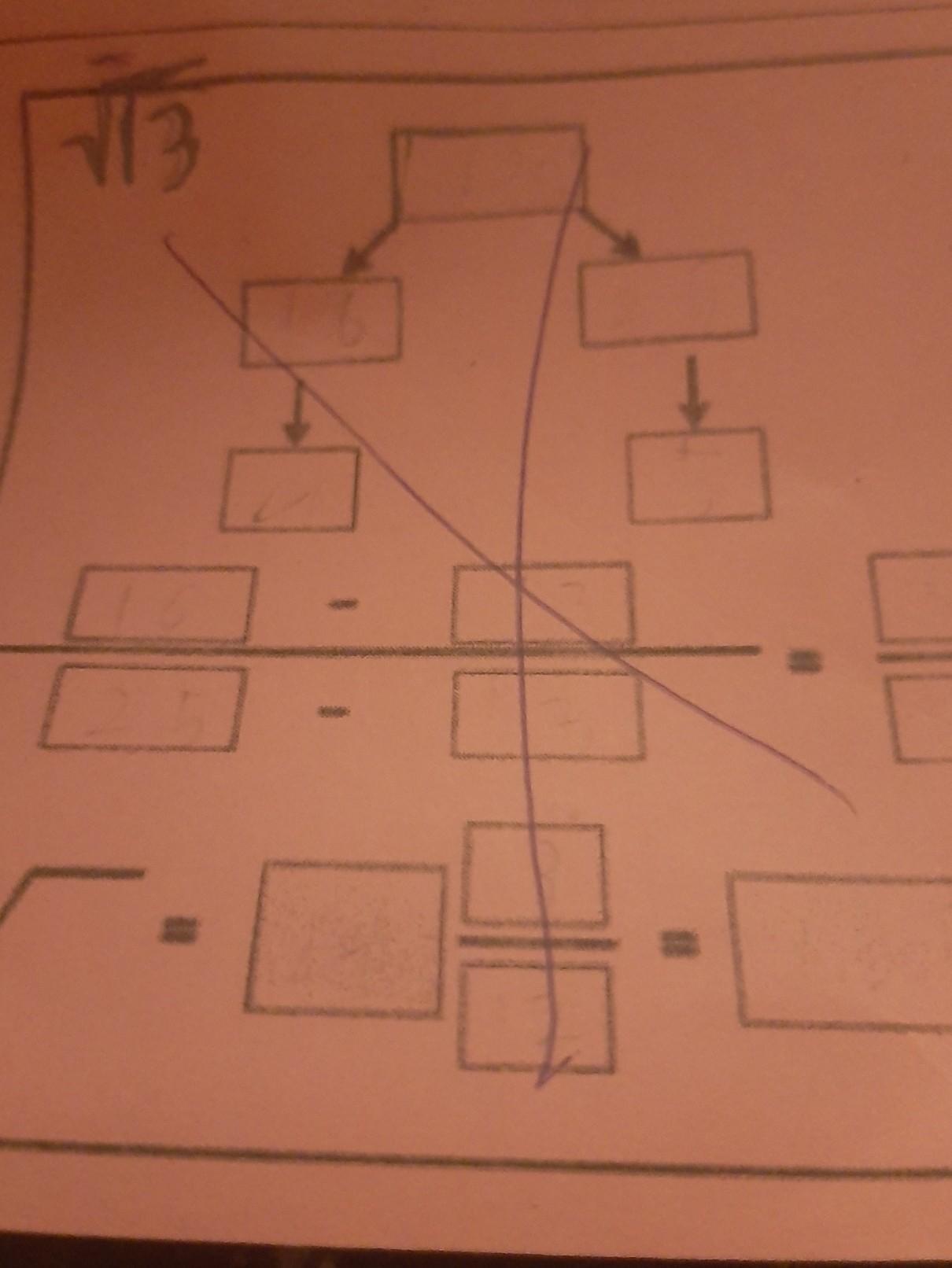 Enter the number you are trying to square root (13) in the top left box, the perfect square above it (16) in the box below, then the perfect square below it (9) in the two boxes to the right of these. Carry out the subtractions and place the numbers in the boxes to the right.