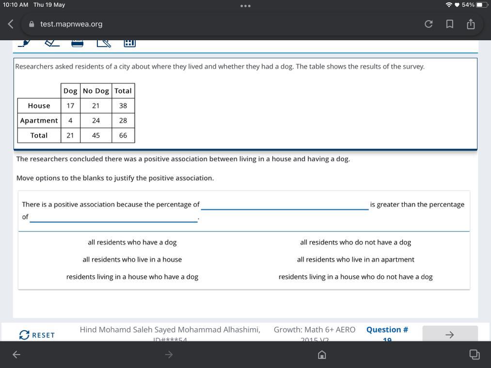 There is a positive association because the percentage of residents living in a house that have a dog is greater than the percentage of all residents who have a dog.