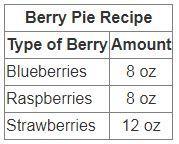 First, let's find out how many ounces of berries it takes to make 8 berry pies. If you got 224, that's correct. If you don't understand, just look at the chart and see how many Blueberries, Raspberries, and Strawberries, in the weight of ounces, which is 8+8+12=28. Then, multiply 28x8=224.