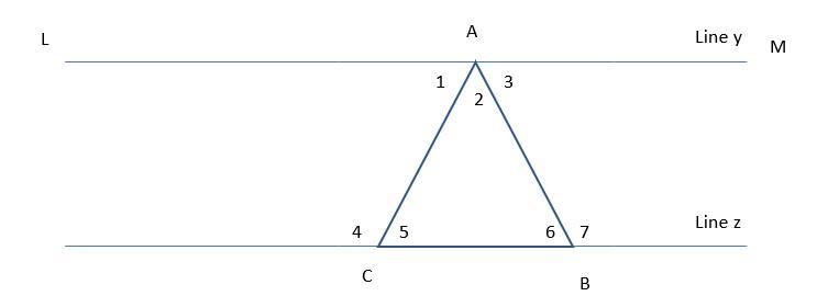 Given that line y is parallel to line z, we have that the transversal AB will make equal corresponding angles with the lines y and z, therefore, ∠6 will be equivalent to segment AB extended