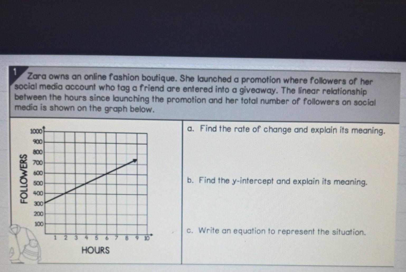 A.) The rate of change, in this case, signifies the number of followers Zora is gaining per hour. It can be found using any two coordinates of the line.