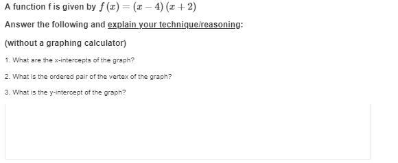 : f(x) = (x- 4)(x + 2)</h2><h3 /><h3>1) What are the x-intercepts of the graph?</h3>