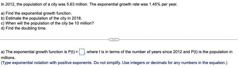 1. In​ 2012, the population of a city was 5.63 million. The exponential growth rate was 1.45​% per year.