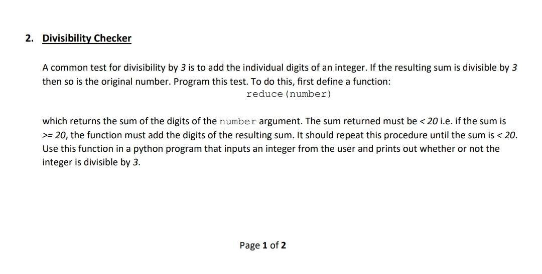 o is the original number. Program this test. To do this, first define a function: reduce(number) which returns the sum of the digits of the number argument. The sum returned must be < 20 i.e. if the sum is >= 20, the function must add the digits of the resulting sum. It should repeat this procedure until the sum is < 20. Use this function in a python program that inputs an integer from the user and prints out whether or not the integer is divisible by 3.​