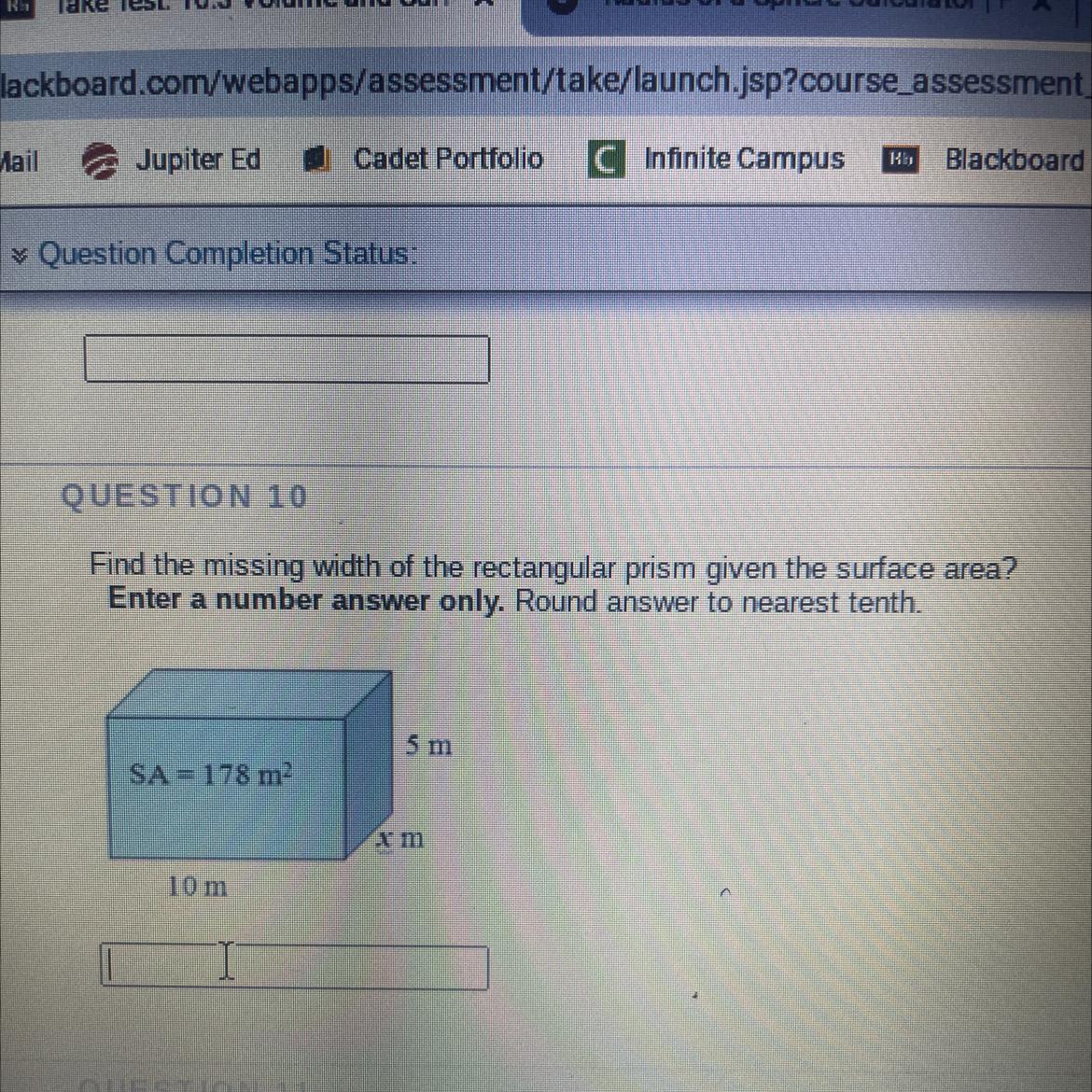 Substitute the known values into this equation: h = 5, l = 10, w = x, S = 178