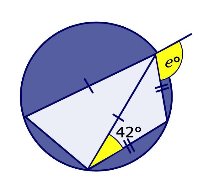 Both triangles are isosceles triangles. Therefore in the smaller triangle, there are two angles that are equal to 42 degrees (the other one is next to e)
