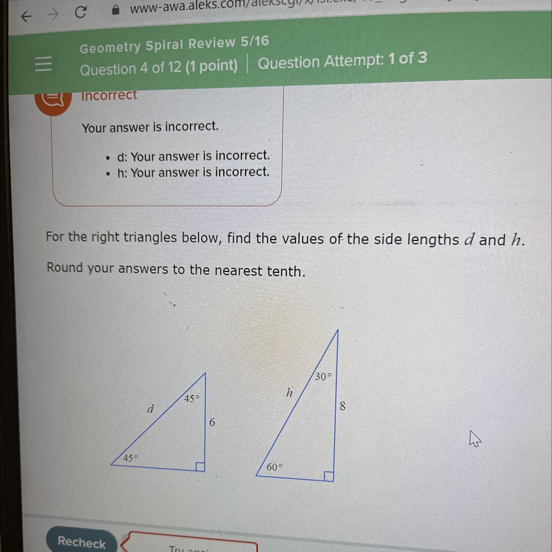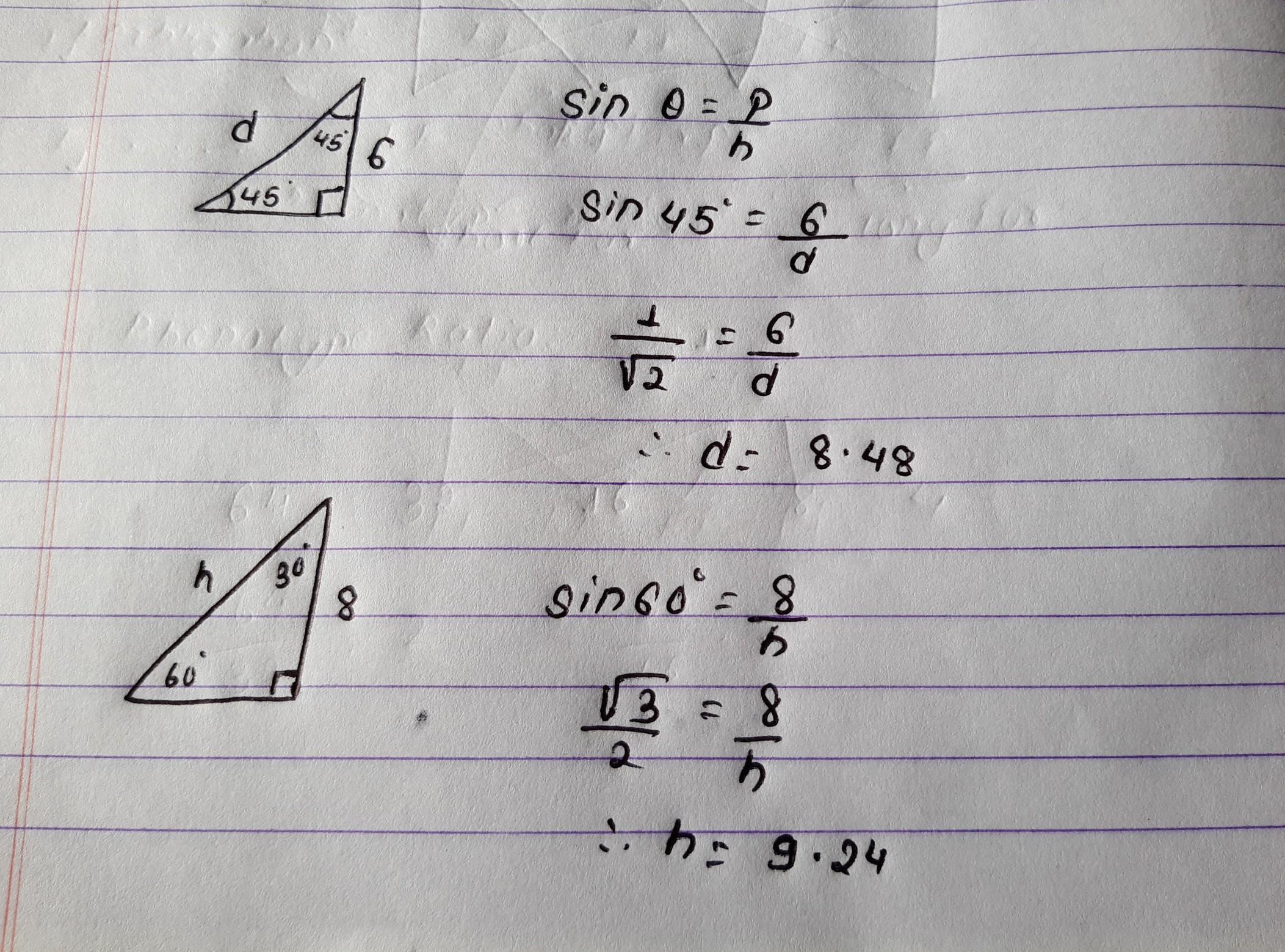 Right triangles below, find the values of the lengths d and h. Round your answers to the nearest tenth