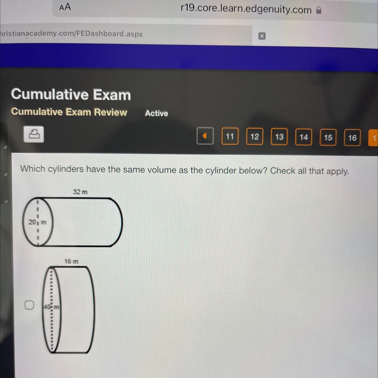 <em>Which Cylinders have the same volume as the cylinder below? Cheok all that apply, height- 20m and base- 32m: </em>