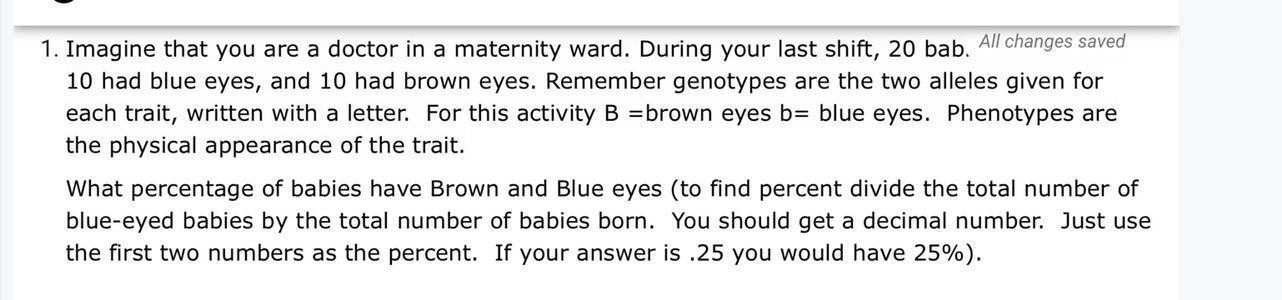% of blue eyes babies is 50% and % of brown eyes babies is also 50% (10/20*100).