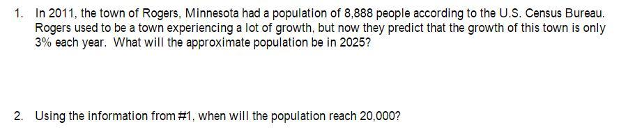 To find the year in which the population will reach 20000, set y = 20000 and solve for x: