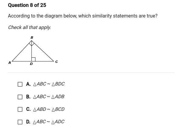 We note that points A, D, C are collinear, so <em>do not form a triangle</em>. This eliminates choice D.