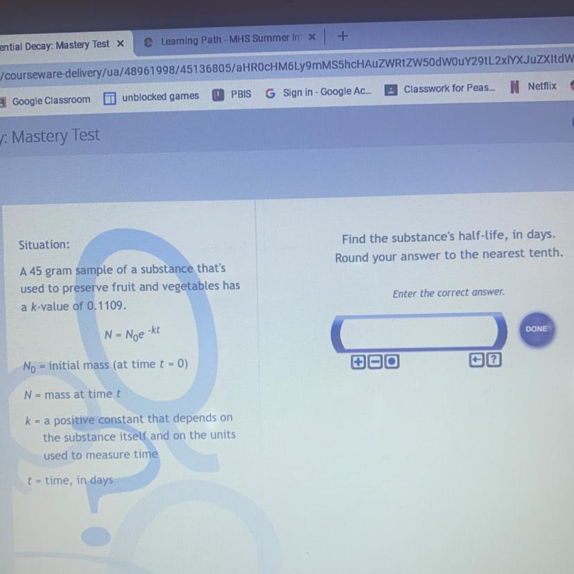 Since we need to find the half life, therefore, the ratio of the initial mass and the mass after half-life will be 1/2.