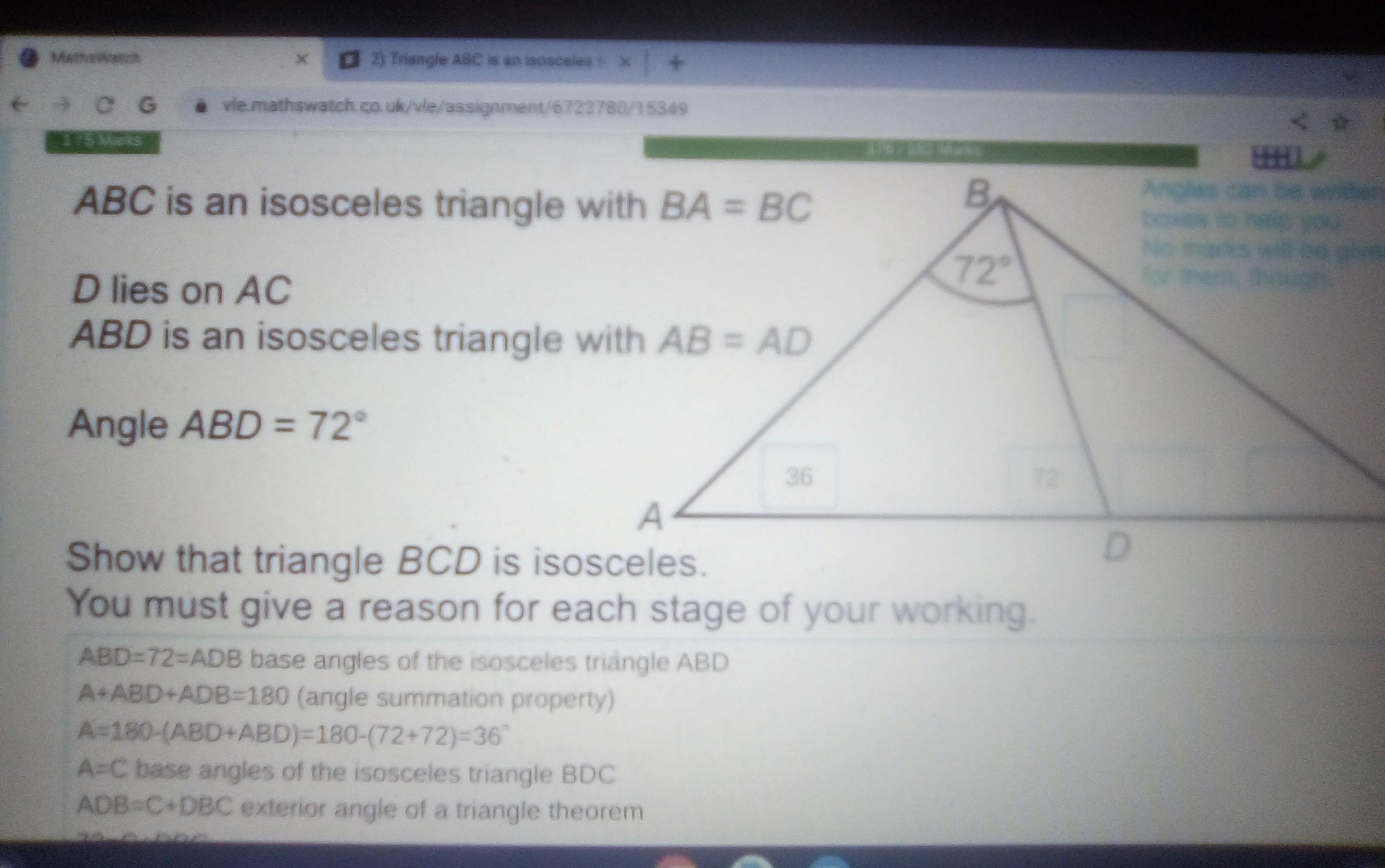 Now, in ΔBCD, the measure of ∠CBD and ∠DCB both equals to 36°. Therefore, we can write, that the ΔBCD is an isosceles triangle.