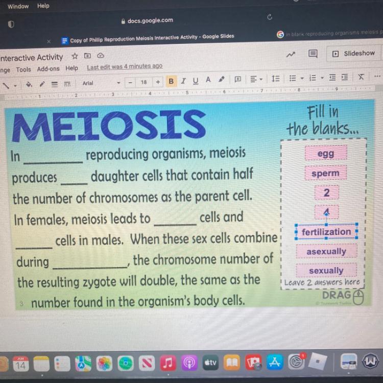 In sexually reproducing organisms, meiosis produces four(4)daughter cells that contain half the number of chromosomes as the parent cell. In females, meiosis leads to egg cells and sperm cells in males. When these sex cells combine during fertilization, the chromosome number of resulting zygote will double, the same as the number found in the organisms body cells.