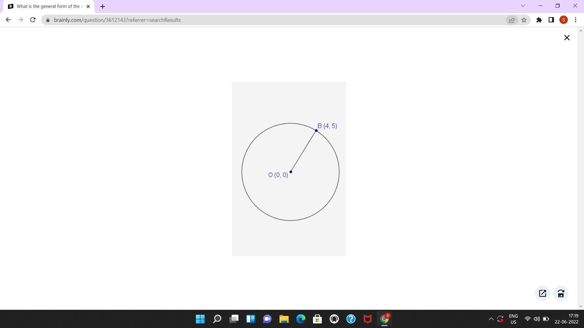 Hence, Center at the origin passing through B(4, 5) is x² +y² = 41.