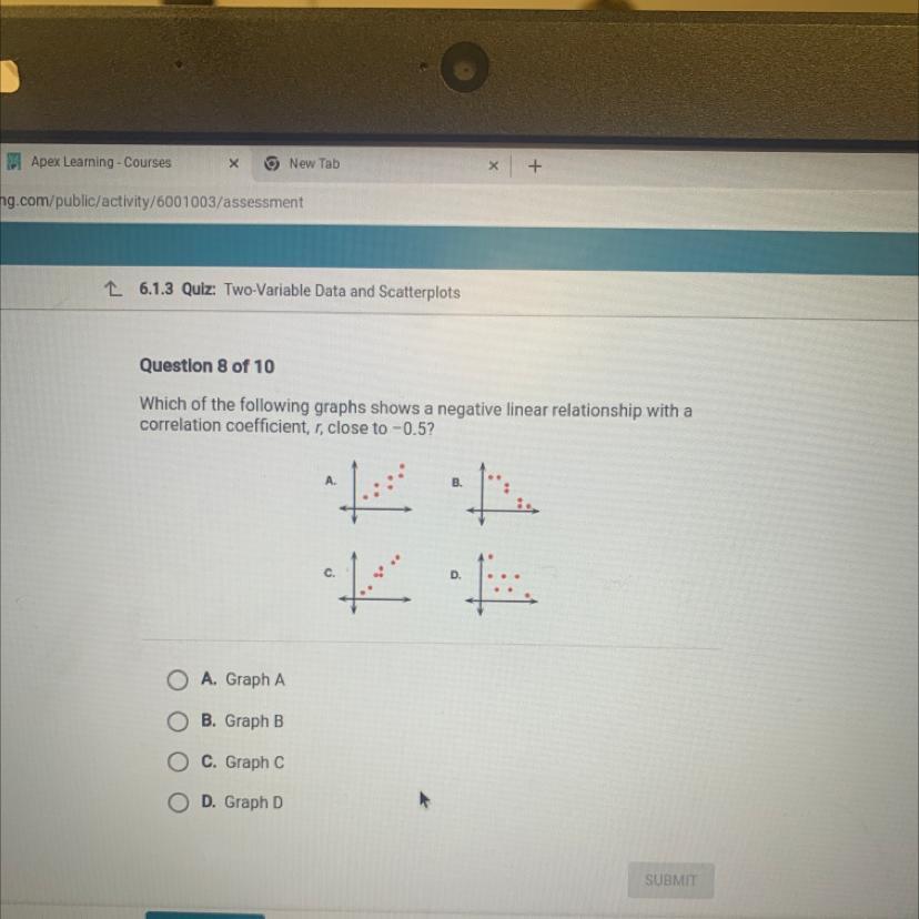 The graphs show a negative linear relationship with a correlation coefficient, r, close to -0.5 in Graph D.