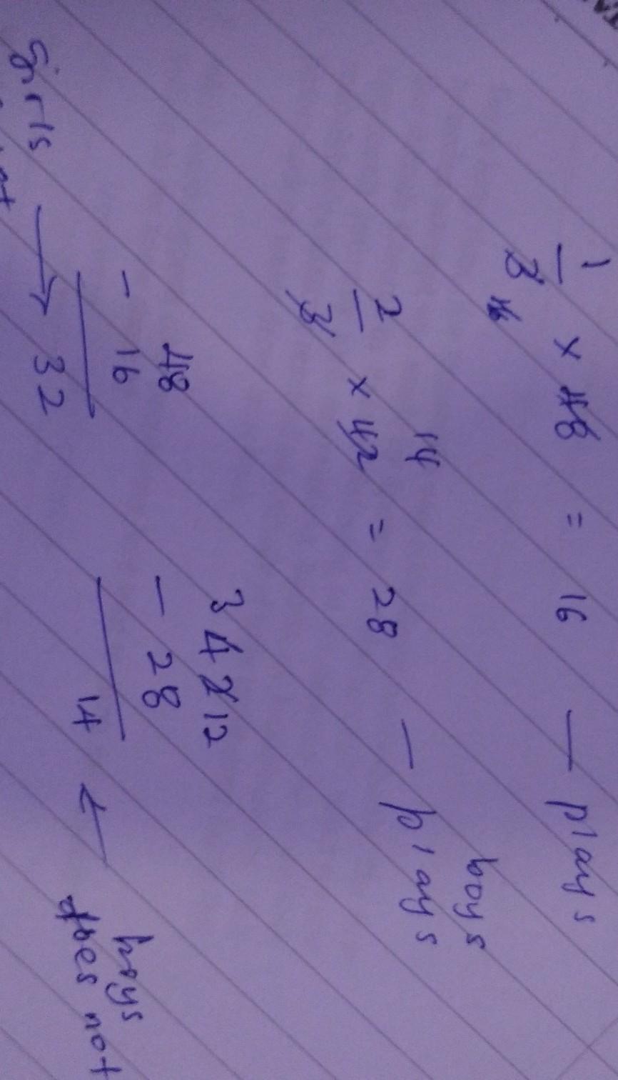 girls plays football = 16 boys plays football = 28 girls does not = 32 boys does not = 14 total number of boys = 42