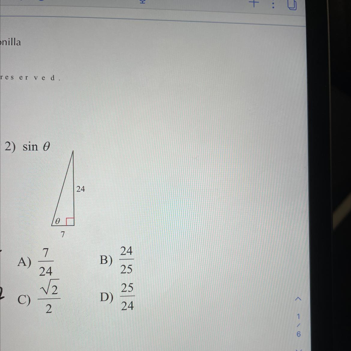 The sine ratio is the ratio of the opposite side (24) to the hypotenuse (25).