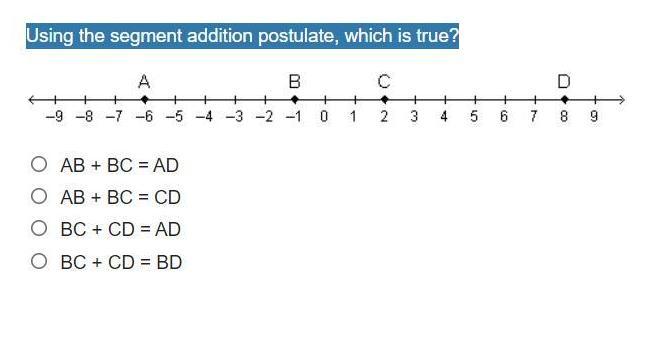 Using the segment addition postulate, the true option is D; BC + CD = BD.